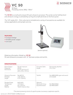 SONICS 超聲波破碎儀 VC 50:是一款小型緊湊的50瓦超聲波處理器。可以用手握住探頭,轉(zhuǎn)動(dòng)前面板上的振幅旋鈕即可激活超聲波能量。包括1/8“探頭(0.5–15mL體積),并提供各種配件,用于各種應(yīng)用和樣品體積。